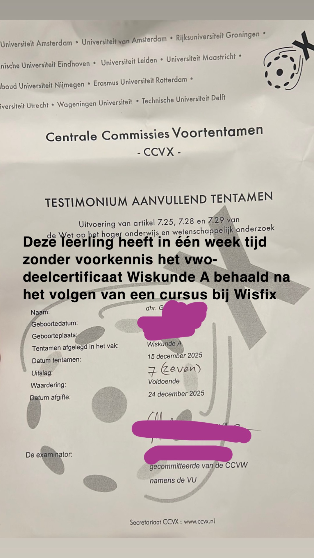 Bij Wisfix vinden wij het belangrijk dat wij transparant zijn naar de cursist toe. Omdat de cursisten de uitslag pas 3-4 weken na het tentamen krijgen weten we niet altijd hoe het is gegaan. Vaak weten we alleen na afloop van het tentamen hoe het is gegaan, maar daarna na 3-4 weken is er vaak geen contact meer. Het is belangrijk dat wij naar onze (toekomstige) klanten eerlijk zijn en daarom werken we alleen met certificaten als bewijs en niet losse teksten. Enkele cursisten benaderen ons weken na het tentamen en sturen hun certificaten. Hieronder een paar certificaten!